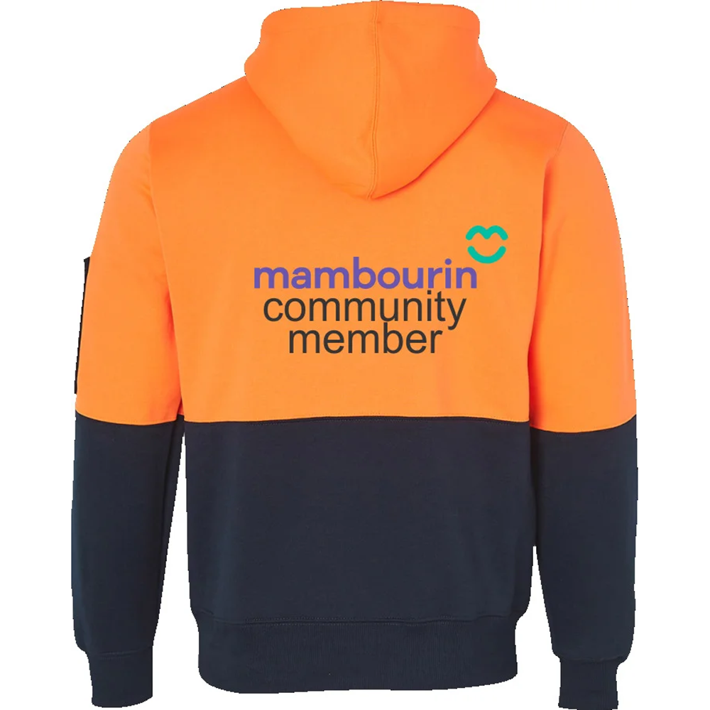 $50.35 Inc GSTThe Hi Vis Orange/Navy Hoodie, made from 280gsm 80% polyester and 20% cotton, features contrast panels, a hood with drawcord, and UPF 50+ protection. With pockets and a “mambourin” logo, this day-use compliant hoodie offers durable comfort and visibility.