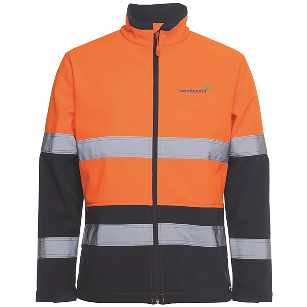 $79.20 Inc GSTThe Hi Vis Orange/Navy Soft Shell Jacket features 245gsm stretch fabric with 10,000mm waterproofing and reflective tape for Biomotion. With side pockets, adjustable sleeves, and a “mambourin” logo, this compliant jacket ensures day/night visibility and comfort.