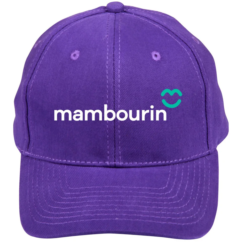 The Cotton Cap, made from 100% heavy brushed cotton, features a 6-panel design, pre-curved peak, and velcro closure. This one-size-fits-all purple cap, adorned with the “mambourin” logo, offers a laid-back, structured style and comfortable fit for all-day wear.