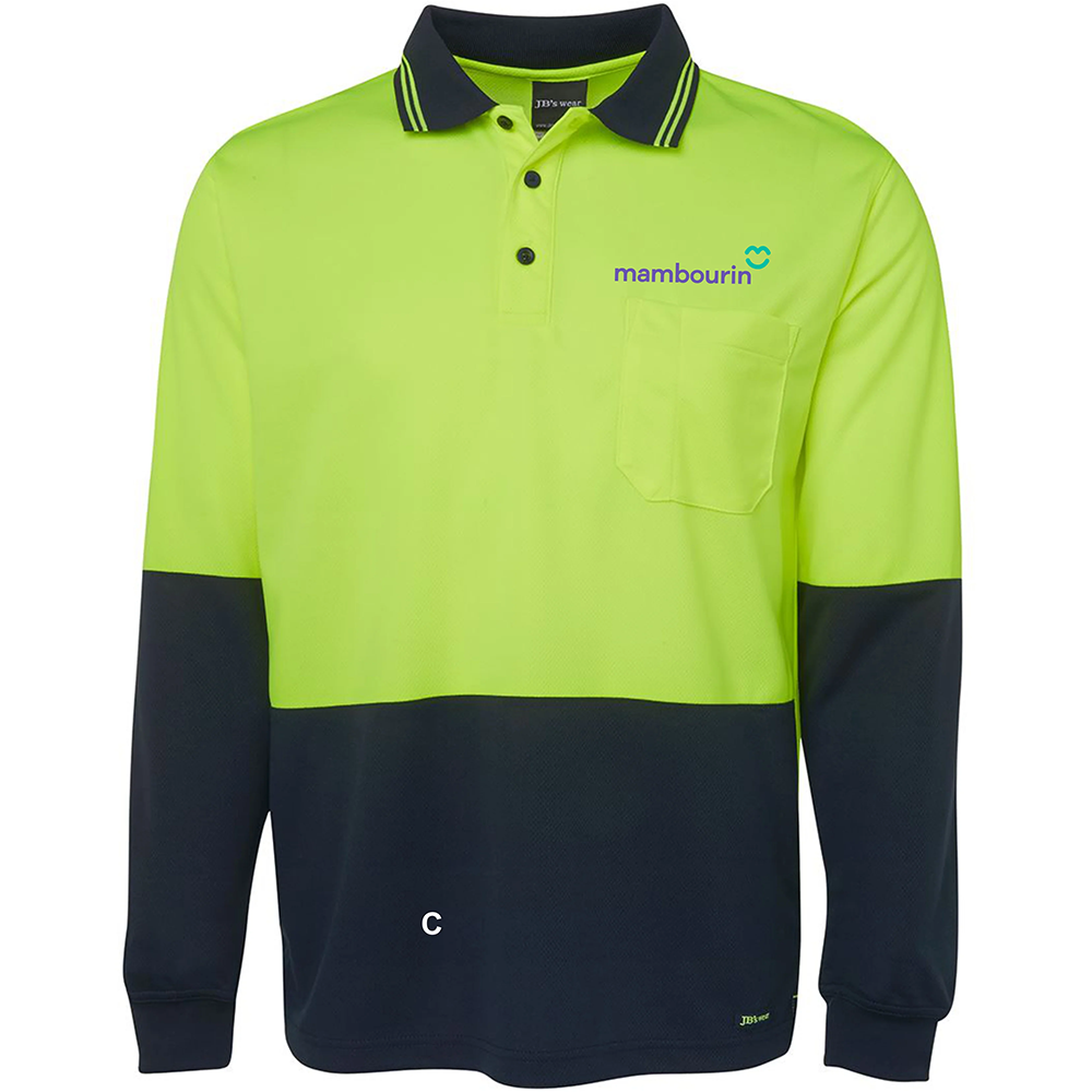 The Hi Vis Polo Long Sleeve, made from 160gsm polyester with Dri™ wicking, features a chest pocket and UPF 50+ protection. Complying with day-use standards, this lime and navy polo with “mambourin” logo is easy-care, quick-drying, and ideal for comfort and visibility.