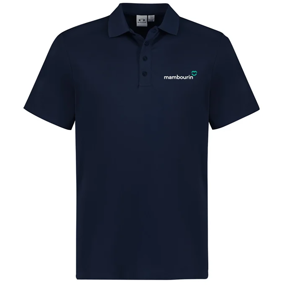 The Men’s Action Polo, made from 155gsm recycled PET polyester with BIZ COOL™ knit and UPF 50+, features a rib collar, longer length, and pocket. With a “mambourin” logo, this navy polo keeps you dry and diverts 10 plastic bottles from landfill.
